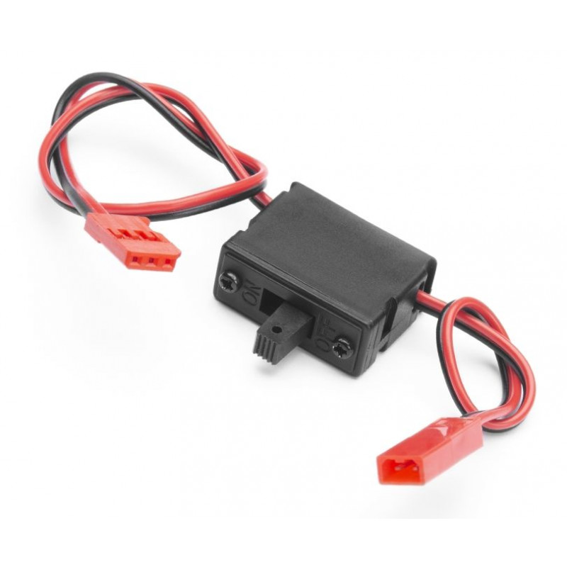 Przełącznik dźwigniowy do akumulatorów odbiornika z dwu-pinowym złączem JST-BEC i złączem serwomechanizmu Futaba po stronie odbiornika.